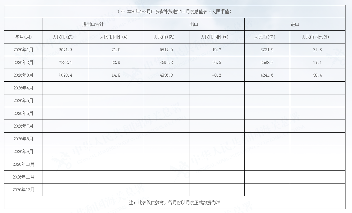 摘要:2026年1-3月广东省外贸进出口月度总值表(人民币值)...